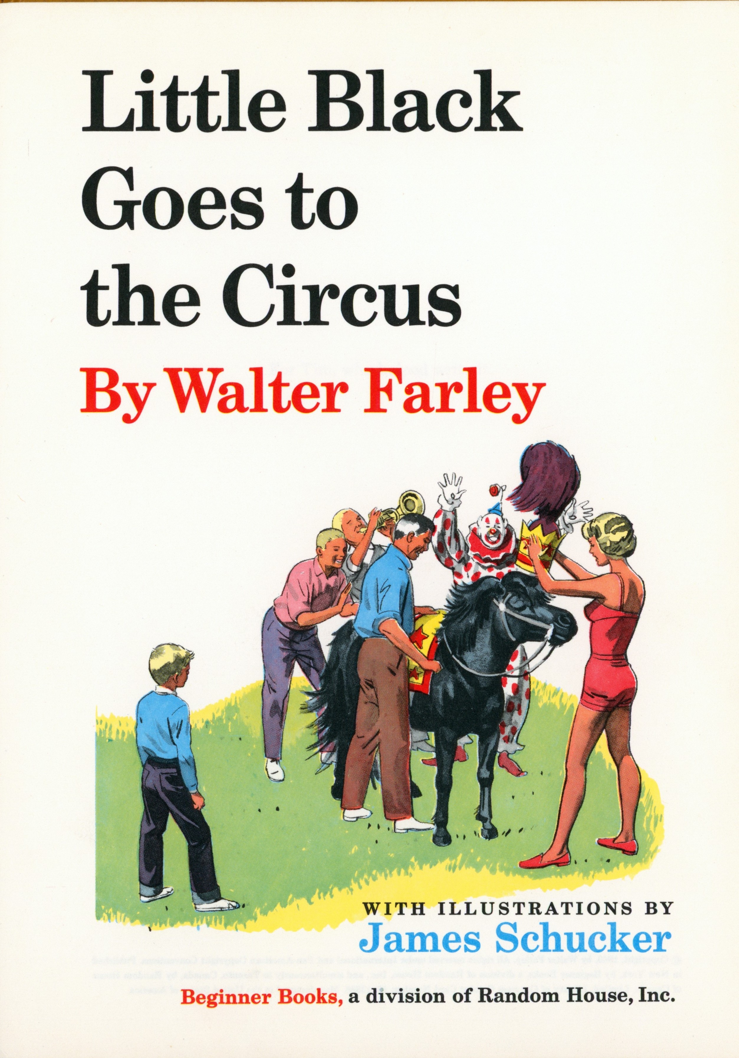 Title Page: "Little Black / Goes To / The Circus / By Walter Farley / [illustration] / WITH ILLUSTRATIONS BY / James Schucker / Beginner Books, a division of Random House, Inc."