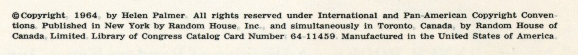 Copyright: "(c) Copyright 1964 by Helen Palmer. All rights reserved under International and Pan-American Copyright Conven- / tions. Published in New York by Random House, Inc., and simultaneously in Toronto, Canada, by Random House of / Canada, Limited. Library of Congress Catalog Card Number: 64-11459. Manufactured in / the United States of America."
