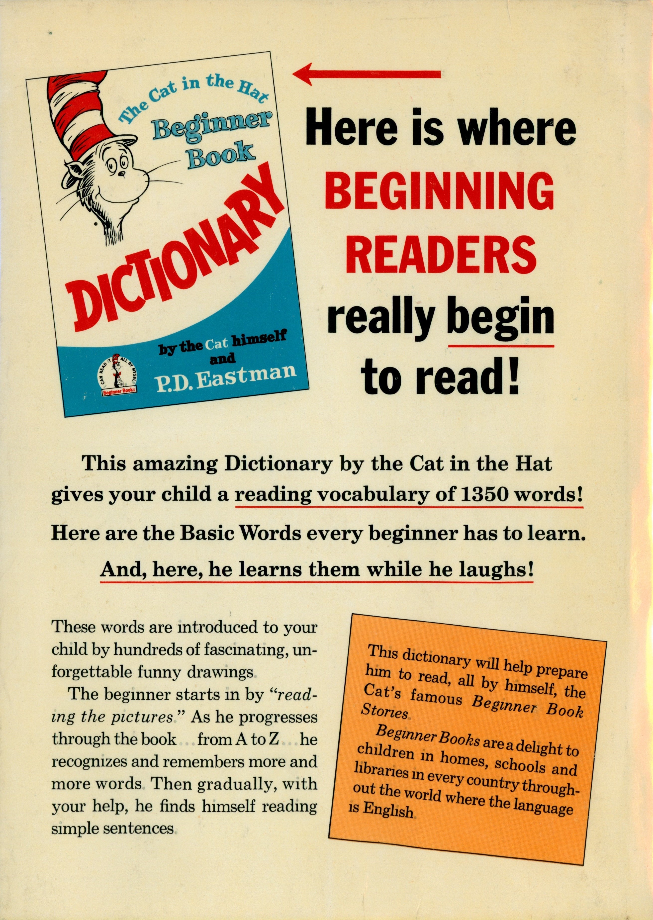 "[The Cat In The Hat Beginner Book Dictionary (1964) front cover] / Here is where / BEGINNING/ READERS / really begin / to read! / [four-lines starting with 'This amazing Dictionary by the Cat in the Hat' / These words are introduced to your ... [... paragraph] / The beginner starts in by "read- ... [... paragraph] / [two paragraphs in orange slanted box as follows: ] The dictionary will help prepare ... [... paragraph] / Beginner Books are a delight to ... [... paragraph]"