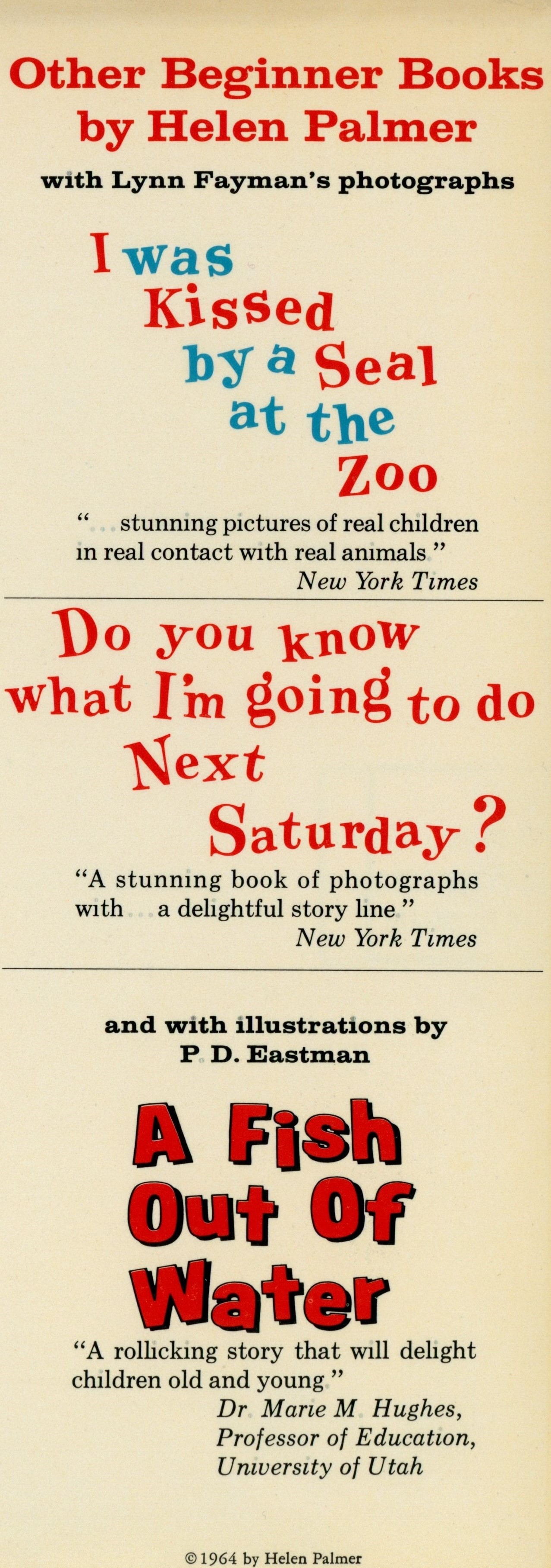 DJ Flap Back: "Other Beginner Books / by Helen Palmer / I was / Kissed / by a Seal / at the / Zoo / [New York Times blurb] / Do you know / what I'm going to do / Next / Saturday? / [New York Times blurb] / A Fish / Out Of / Water / [Dr. Marie M. Hughes blurb] / (c) 1964 by Helen Palmer"