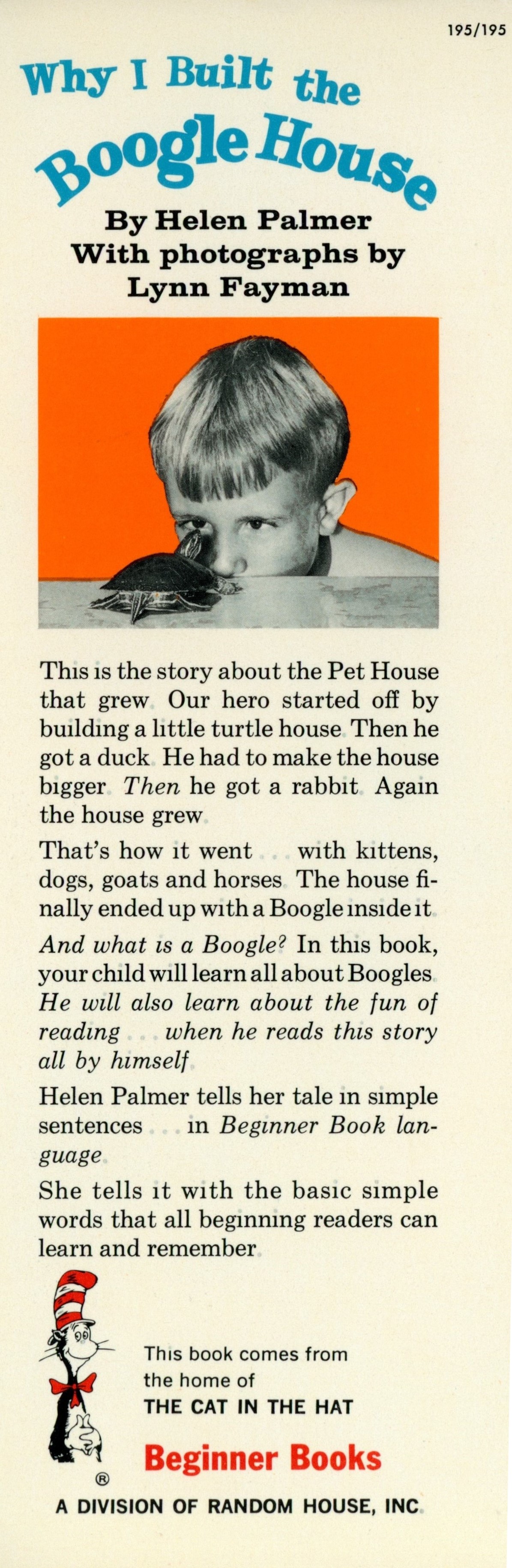 DJ Flap Front: "195/195 [top right] / Why I Built The / Boogle House / By Helen Palmer / With photographs by / Lynn Fayman / This is the story about the Pet House ... [... paragraph] / That's how it went ... with kittens ... [...paragraph] / And what is a Boogle! In this book ... [... paragraph] / Helen Palmer tells her tale in simple ... [... paragraph] / She tells it with the basic simple ... [... paragraph] / This book comes from / the home of / THE CAT IN THE HAT / Beginner Books / A DIVISION OF RANDOM HOUSE, INC"