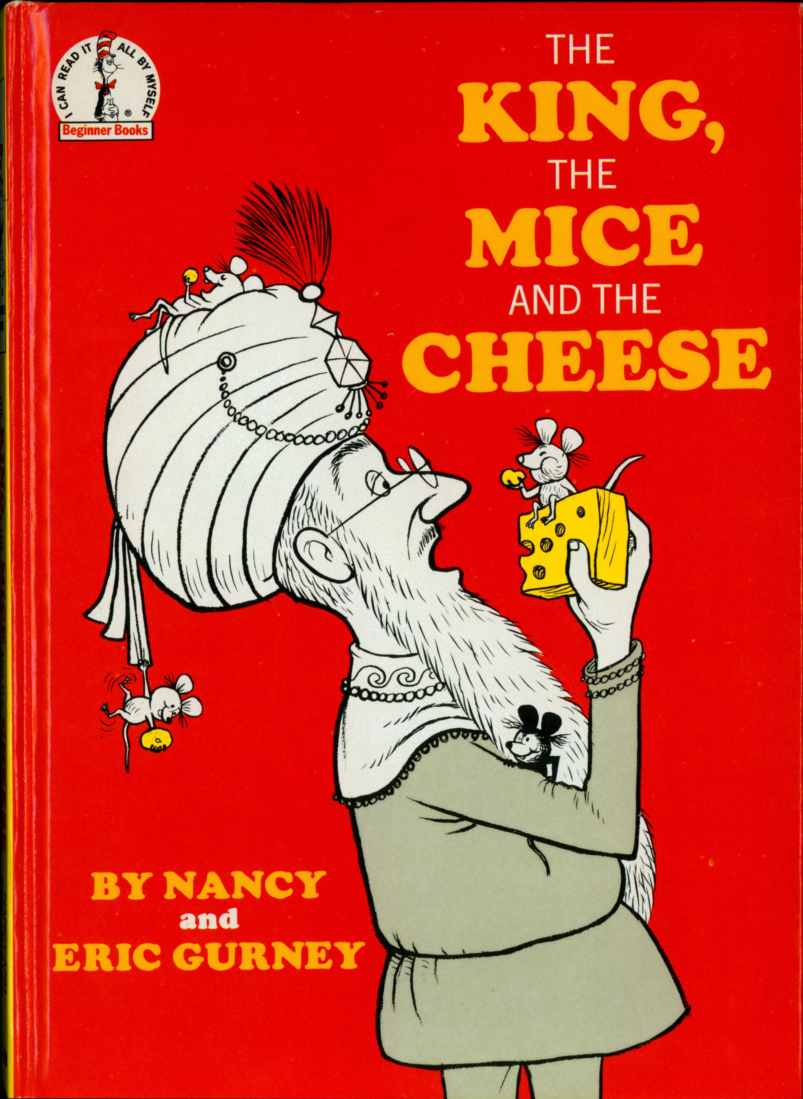 Book Front: Bound in glossy red paper covered boards with color illustration. "[Beginner Books logo top left} / THE / KING, / THE / MICE / AND THE / CHEESE / BY NANCY / and ERIC GURNAY"