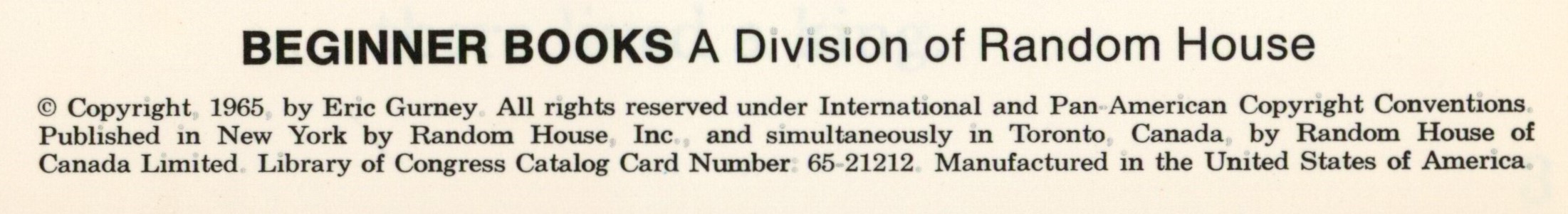 Copyright: "(c) Copyright 1965 by Eric Gurney. All rights reserved under International and Pan-American Copyright Conventions. / Published in New York by Random House, Inc., and simultaneously in Toronto, Canada, by Random House of / Canada, Limited. Library of Congress Catalog Card Number: 65-21212. Manufactured in / the United States of America."