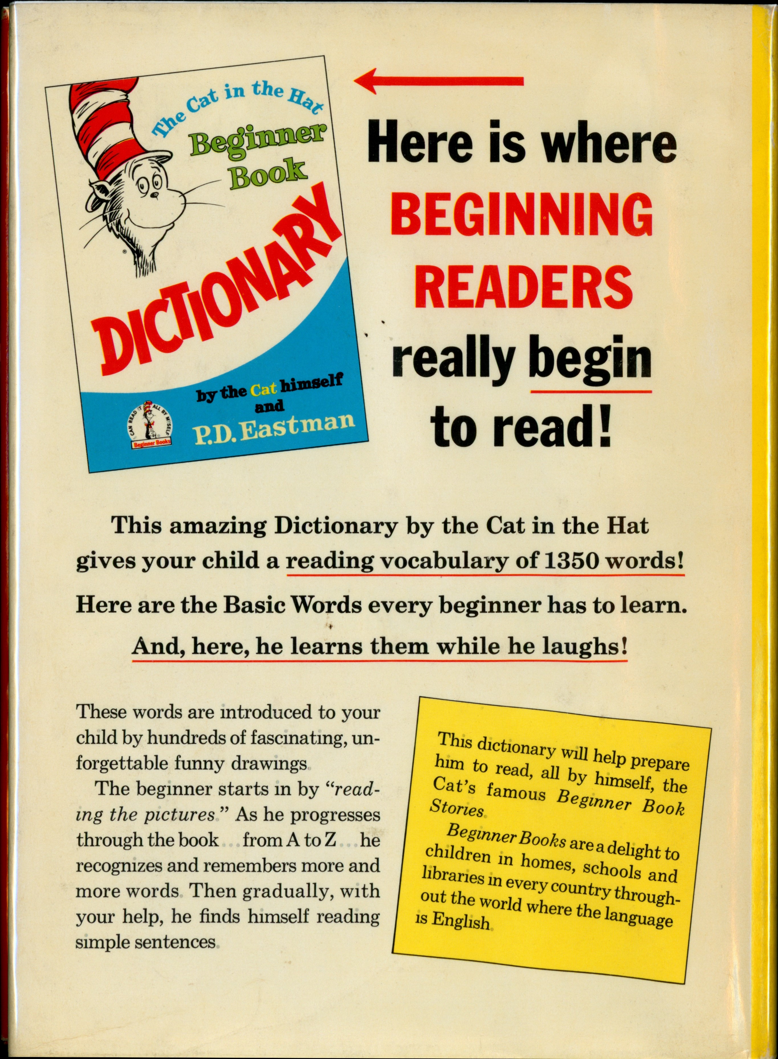 "[The Cat In The Hat Beginner Book Dictionary (1964) front cover] / Here is where / BEGINNING/ READERS / really begin / to read! / [four-lines starting with 'This amazing Dictionary by the Cat in the Hat' / These words are introduced to your ... [... paragraph] / The beginner starts in by "read- ... [... paragraph] / [two paragraphs in orange slanted box as follows: ] The dictionary will help prepare ... [... paragraph] / Beginner Books are a delight to ... [... paragraph]"