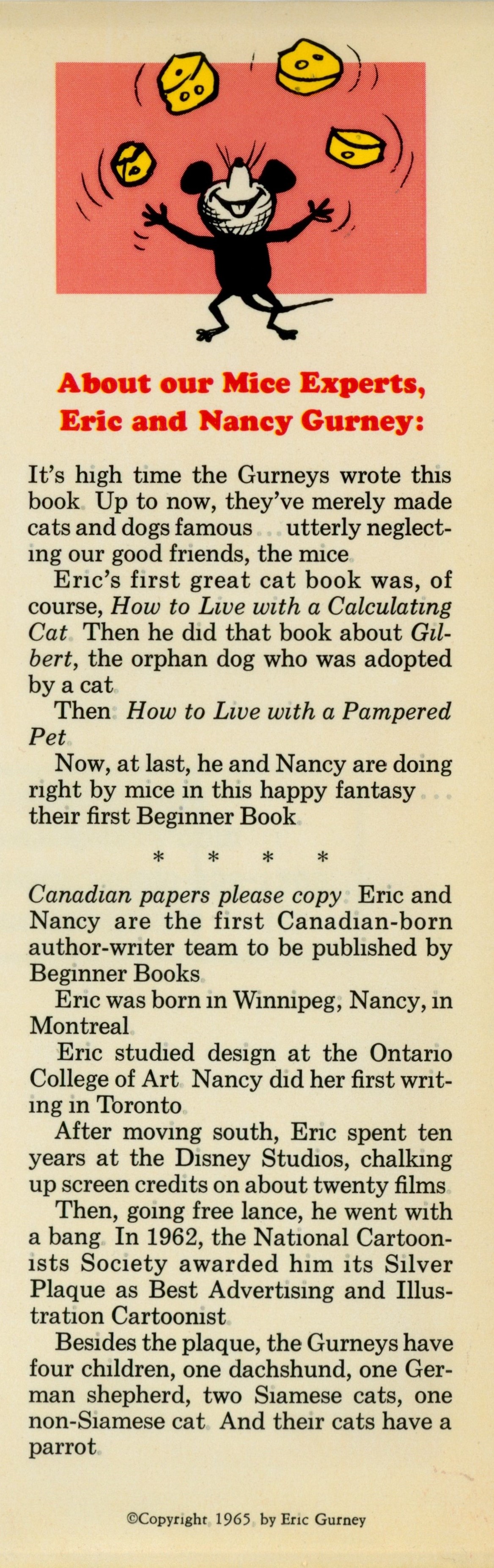 DJ Flap Back: "[Illustration] / About our Mice Experts, / Eric and Nancy Gurney: / [Four paragraph Gurney biography] / Canadian papers please copy: Eric and ... [...paragraph} / [Five paragraph Gurney biography] / (c)Copyright, 1965, by Eric Gurney"