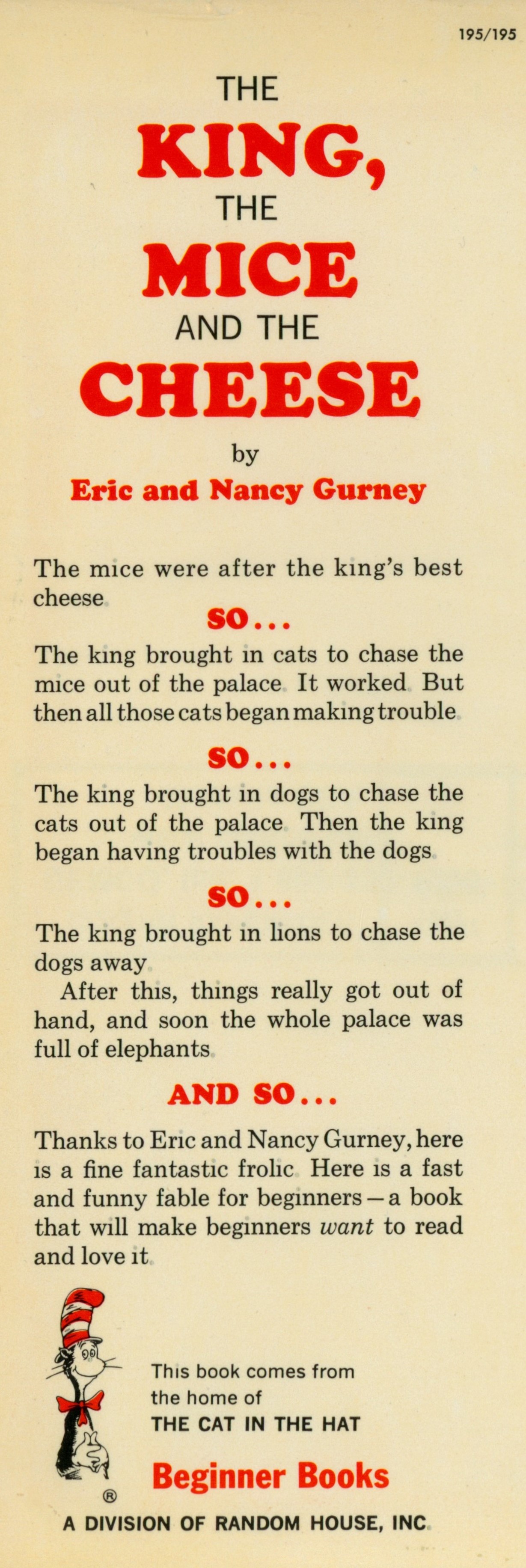 DJ Flap Front: "195/195 [top right] / THE / KING, / THE / MICE / AND THE / CHEESE / by / Eric and Nancy Gurney / The mice were after the king's best / cheese / SO... / The king brought in cats to chase the ... [... paragraph] / SO ... / The king brought in dogs to chase the ... [...paragraph] / SO ... / The king brought in lions to chase the / dogs away / AND SO ... / Thanks to Eric and Nancy Gurney, here ... [... paragraph] / This book comes from / the home of / THE CAT IN THE HAT / Beginner Books / A DIVISION OF RANDOM HOUSE, INC."
