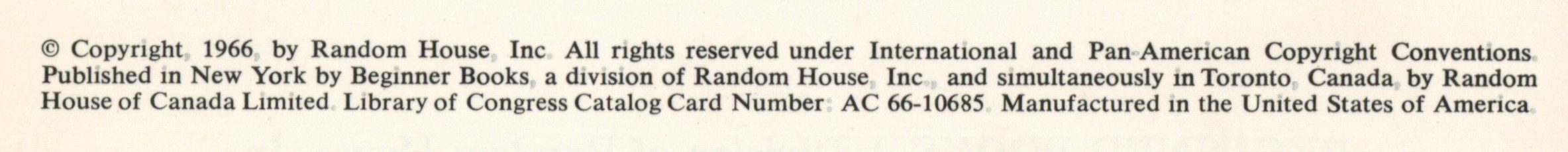 Copyright: "To Ted and Helen / (c) Copyright 1966 by Random House, Inc. All rights reserved under International and Pan-American Copyright Conventions. / Published in New York by Beginner Books, a division of Random House, Inc., and simultaneously in Toronto, Canada, by Random / House of Canada, Limited. / Library of Congress Catalog Card Number: 66-10685. Manufactured in the United States of America."