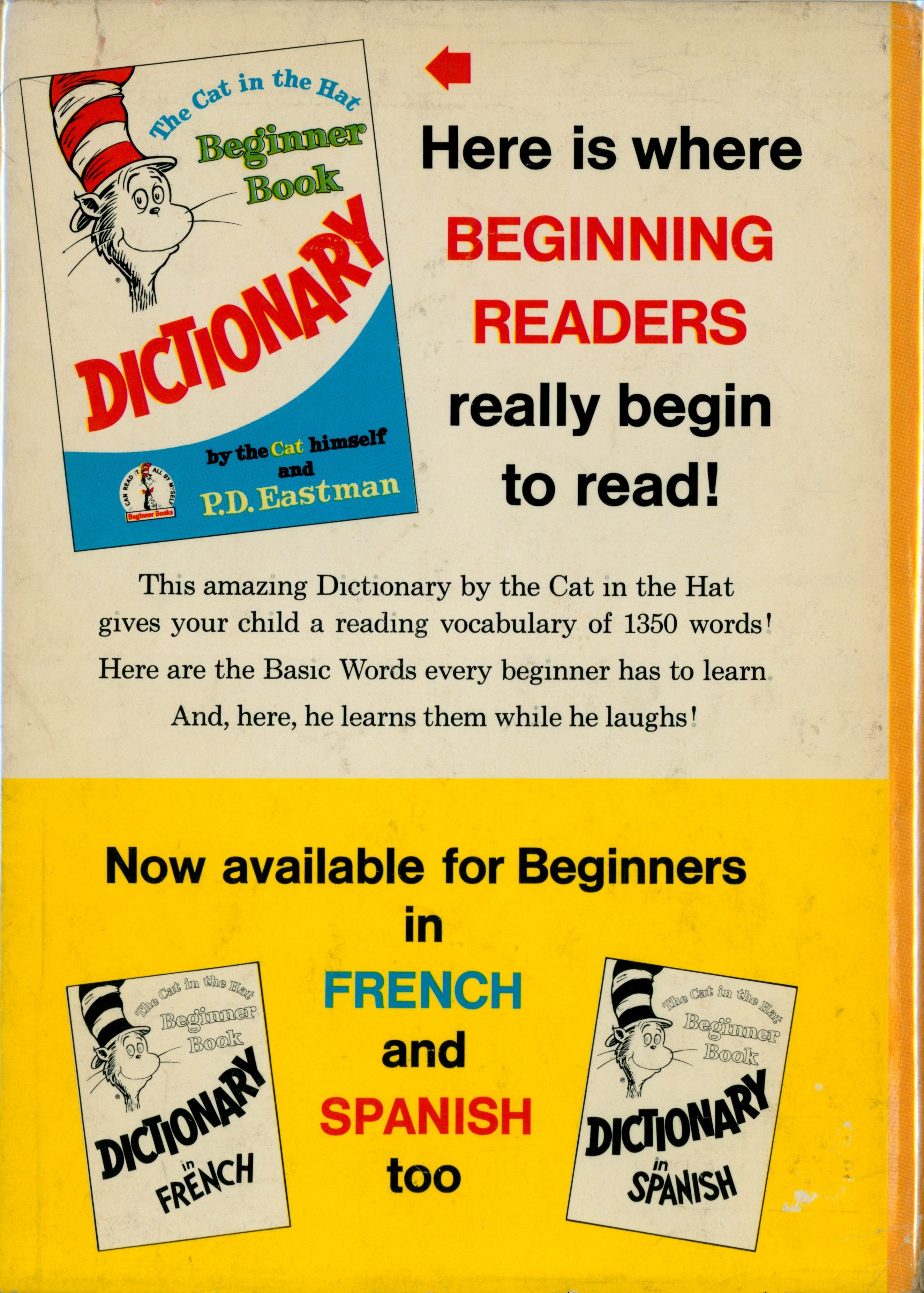 "[The Cat In The Hat Beginner Book Dictionary (1964) front cover] / Here is where / BEGINNING/ READERS / really begin / to read! / [four-lines starting with 'This amazing Dictionary by the Cat in the Hat' / Now available for Beginners / in / ['CITH BB Dictionary FRENCH' cover] / FRENCH / ['CITH BB Dictionary SPANISH' cover] / and / SPANISH / too"
