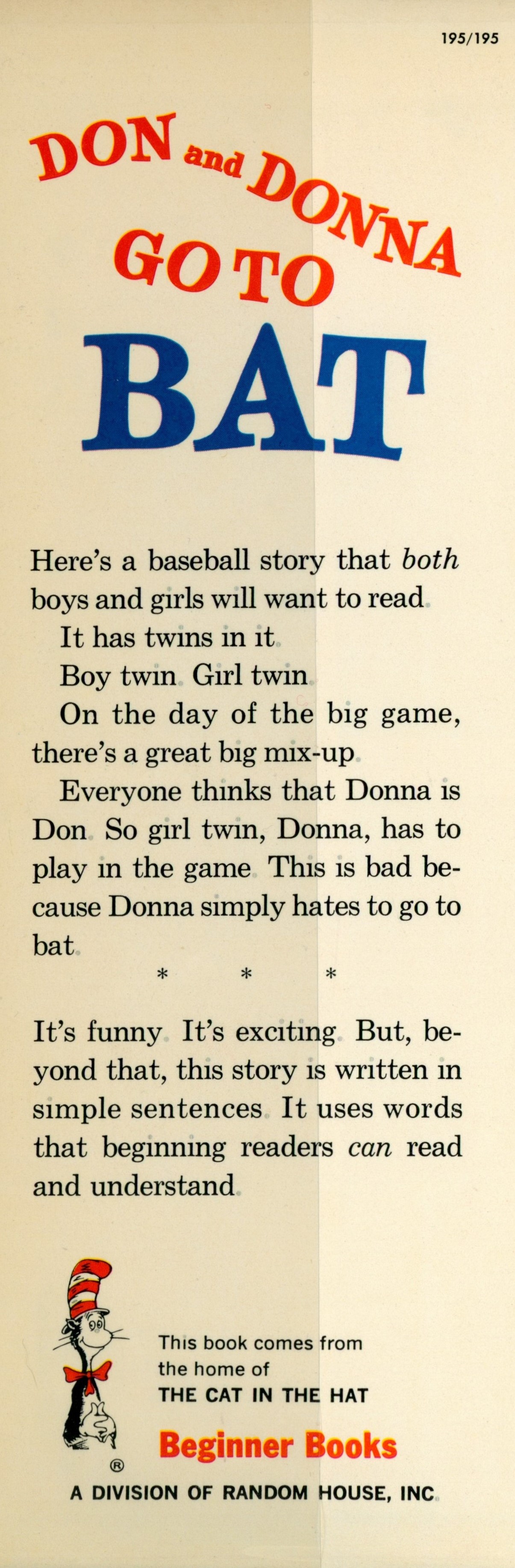 DJ Flap Front: "195/195 [top right] / DON and DONNA / GO TO / BAT / Here's a baseball story that both / boys and girls will want to read. / It has twins in it. / Boy twin. Girl twin. / On the day of the big game, / there's a great big mix-up / Everyone thinks that Donna is ... [... paragraph] / * * * / It's funny. It's exciting. But, be- ... [... paragraph] / This book comes from / the home of / THE CAT IN THE HAT / Beginner Books / A DIVISION OF RANDOM HOUSE, INC."