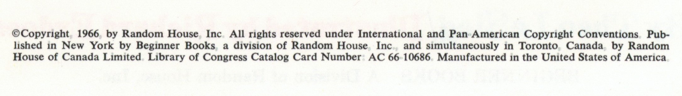 Copyright: "(c) Copyright 1966 by Random House. All rights reserved under International and Pan-American Copyright Conventions. Pub- / lished in New York by Beginner Books, a division of Random House, Inc., and simultaneously in Toronto, Canada, by Random / House of Canada, Limited. Library of Congress Catalog Card Number: 66-10686. Manufactured in the United States of America."