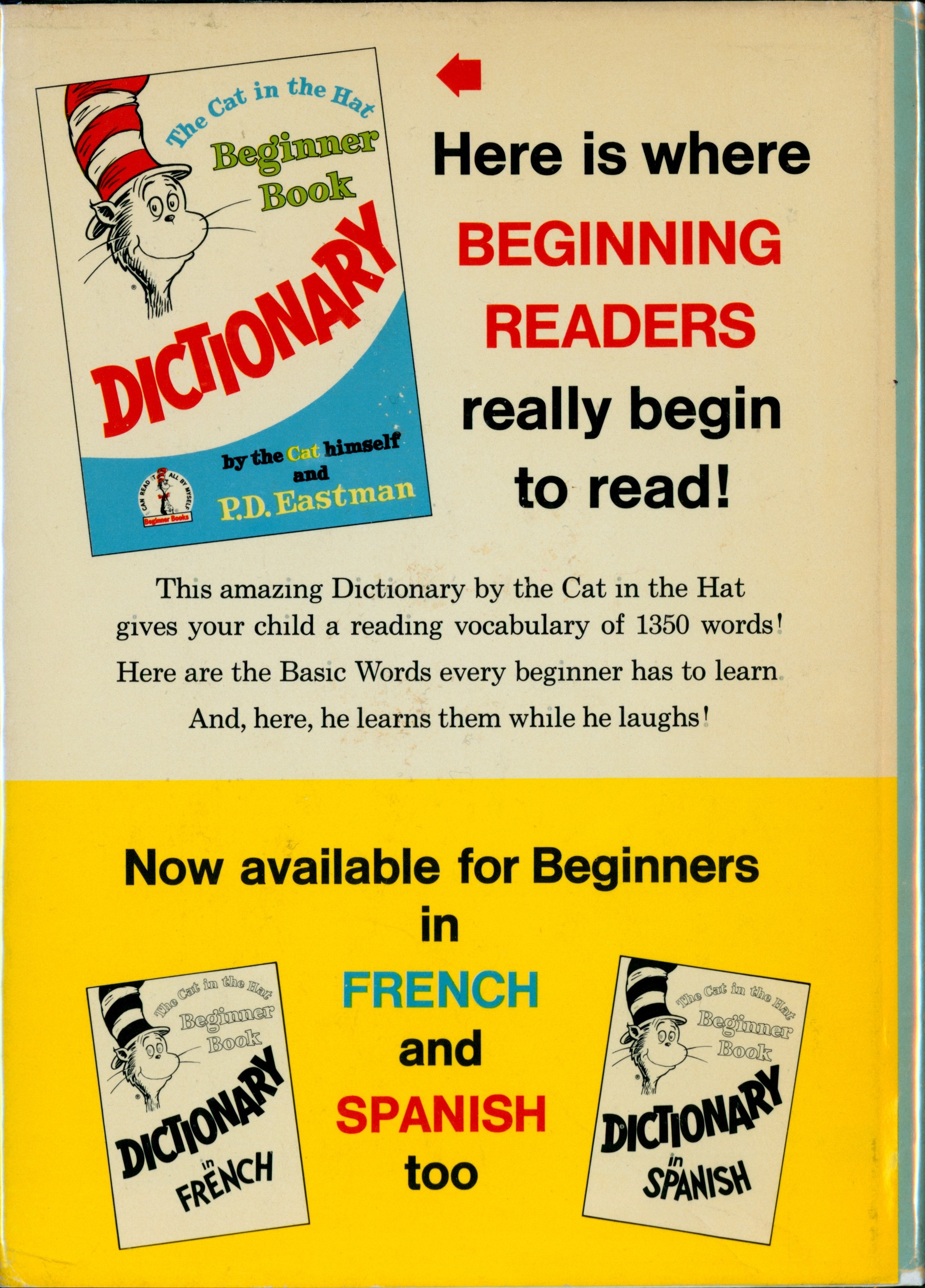 "[The Cat In The Hat Beginner Book Dictionary (1964) front cover] / Here is where / BEGINNING/ READERS / really begin / to read! / [four-lines starting with 'This amazing Dictionary by the Cat in the Hat' / Now available for Beginners / in / ['CITH BB Dictionary FRENCH' cover] / FRENCH / ['CITH BB Dictionary SPANISH' cover] / and / SPANISH / too"