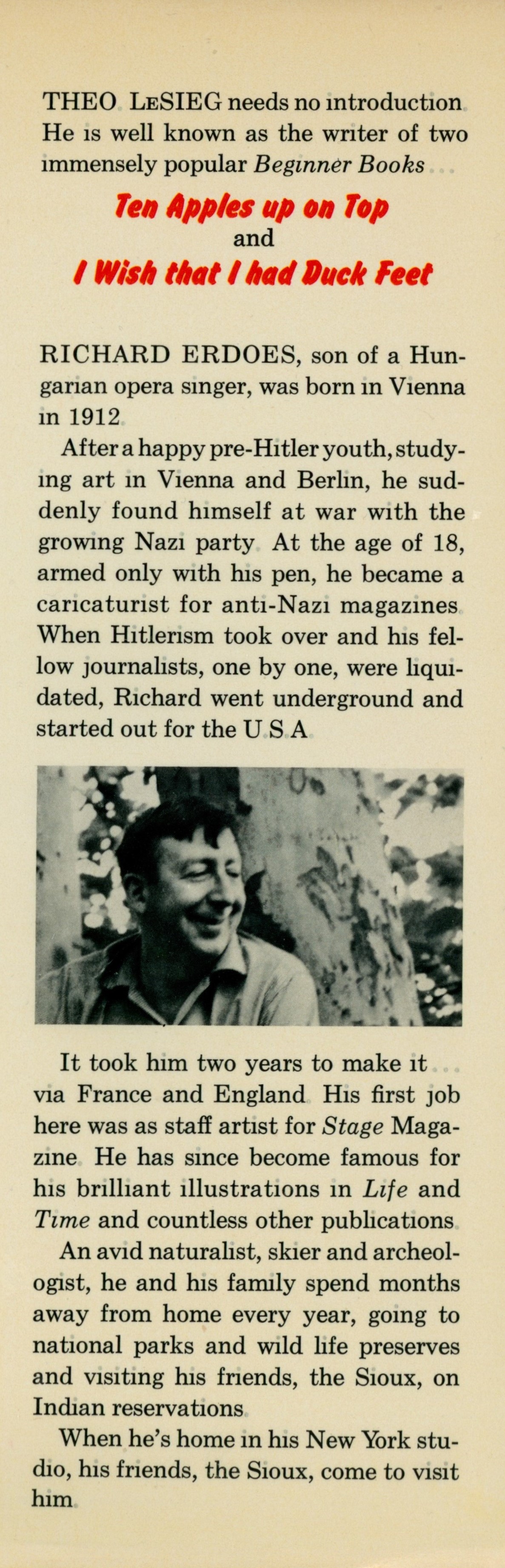 DJ Flap Back: "THEO LeSieg needs no introduction. / He is well known as the writer of two / immensely popular Beginner Books ... / Ten Apples up on Top / and / I Wish that I had Duck Feet / [Two paragraph Richard Erdoes bio] / [Photo of Erdoes] / [Three paragraph Richard Erdoes bio]"