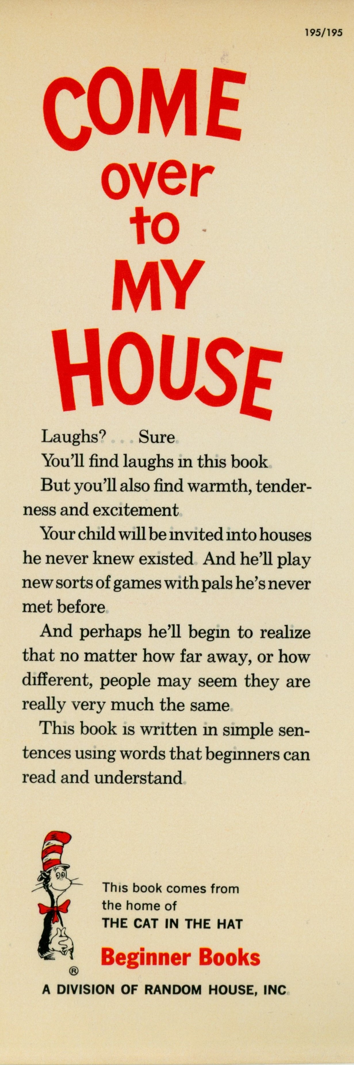 DJ Flap Front: "195/195 [top right] / COME / over / to / MY / HOUSE / Laughs? ... Sure / You'll find laughs in this book. / But you'll also find warmth, tender- / ness and excitement / Your child will be invited into houses ... [... paragraph] / And perhaps he'll begin to realize ... [...paragraph] / This book is written in simple sen- ... [... paragraph] / This book comes from / the home of / THE CAT IN THE HAT / Beginner Books / A DIVISION OF RANDOM HOUSE, INC."