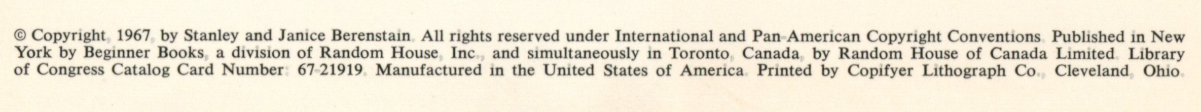 Copyright: "(c) Copyright 1967 by Stanley and Janice Berenstain. All rights reserved under International and Pan-American Copyright Conventions. Published in New / York by Beginner Books, a division of Random House, Inc., and simultaneously in Toronto, Canada, by Random House of Canada, Limited. Library / of Congress Catalog Card Number: 67-21919. Manufactured in / the United States of America. Printed by Copifyer Lithograph Co., Cleveland, Ohio."