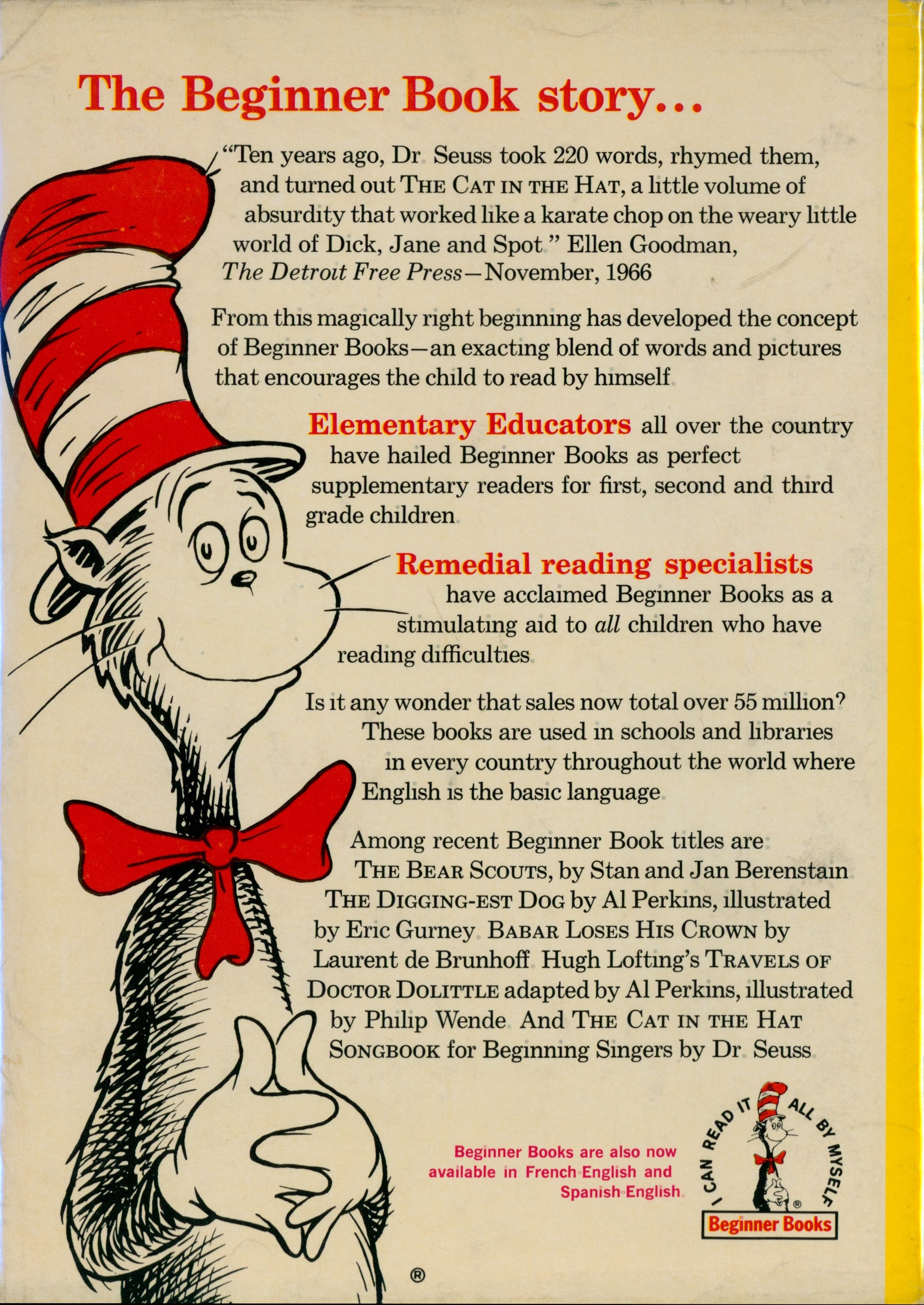 "The Beginner Book story ... / [Large 'Cat In The Hat' image at left] / "Ten years ago, Dr. Seuss took 220 words, rhymed them, ... [... paragraph] / From this magically right beginning has developed the concept ... [... paragraph] / Elementary Educators all over the country ... [... paragraph] / Remedial reading specialists ... [... paragraph] / Is it any wonder that sales now total over 55 million? ... [... paragraph] / Among recent Beginner Book titles are: / THE BEAR SCOUTS, by Stan and Jan Berenstain ... [... paragraph] / [BB logo] / Beginner Books are also now / available in French-English and / Spanish-English"