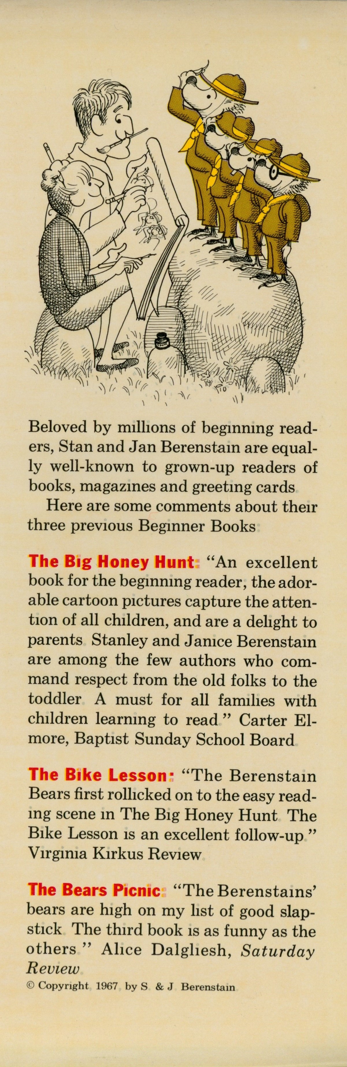 DJ Flap Back: "[Illustration} / Beloved by millions of beginning read- ... [... paragraph] / Hera are some comments about their / three previous Beginner -Books: / The Big Honey Hunt: "An excellent ... [... paragraph] / The Bike Lesson: "The Berenstain ... [... paragraph] / The Bears Picnic: "The Berenstains' ... [... paragraph] / (c)Copyright 1967, by S. & J. Berenstain"