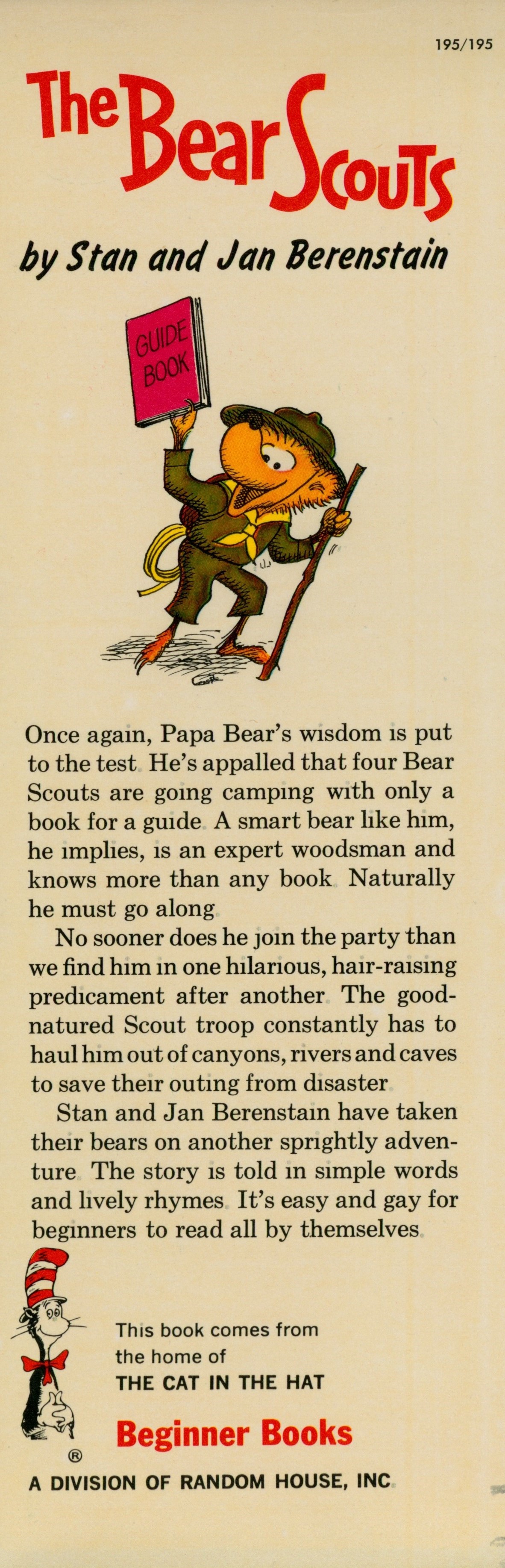 DJ Flap Front: "195/195 [top right] / The Bear Scouts / by Stan and Jan Berenstain / [Illustration] / Once again, Papa Bear's wisdom is put ... [... paragraph] / No sooner does he join the party than ... [...paragraph] / Stan and Jan Berenstain ... [... paragraph] / This book comes from / the home of / THE CAT IN THE HAT / Beginner Books / A DIVISION OF RANDOM HOUSE, INC."