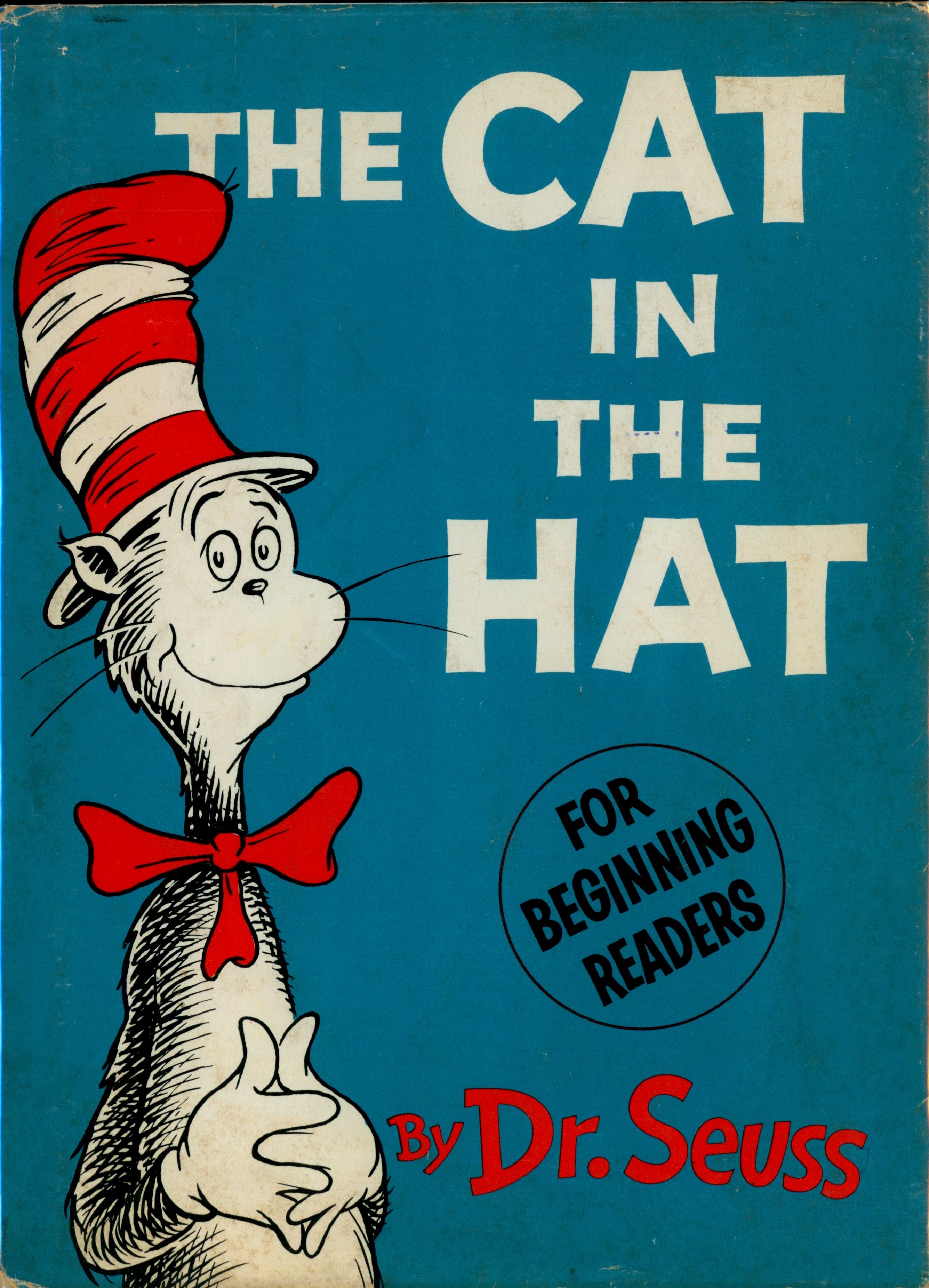 The front dust jacket for the first edition has the Cat in his familiar posture, however has 'For Beginning Readers' in a circle at a 45 degree backward